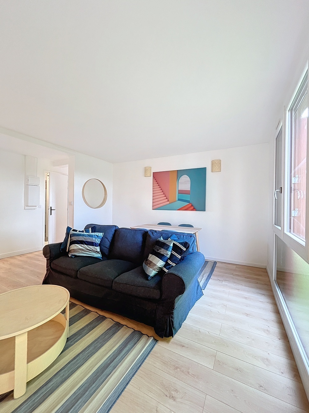 Cet appartement de 5 pièces est composé d’un grand séjour avec canapé, TV, 1 table haute, chaises…