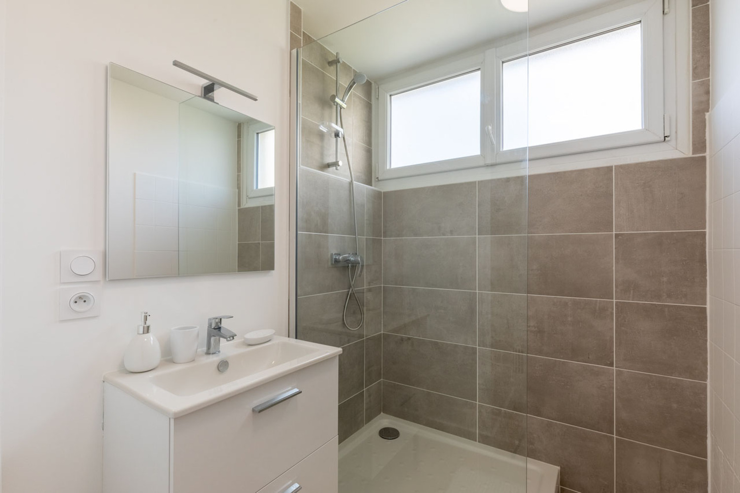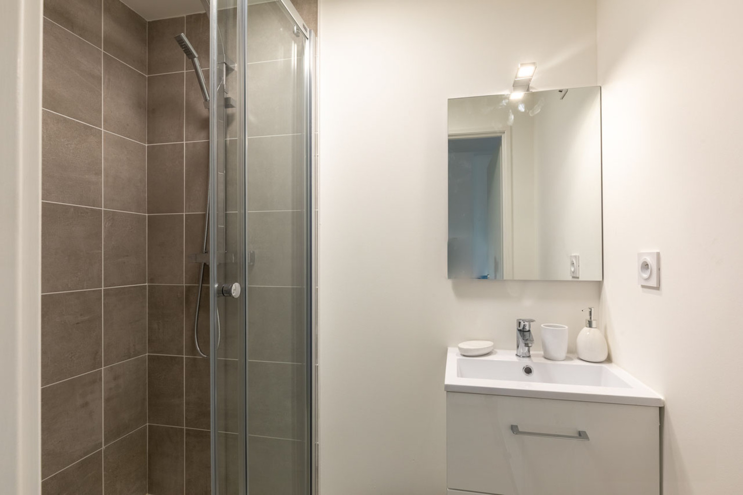 -Salle d’eau : douche, vasque, sèche serviette et machine à laver